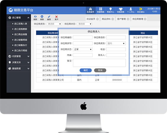 顺利获得现货平台可以实现进口管理、内贸管理,可查看从采购录入、流程跟踪、商品销售、销售明细、销售执行、执行明细等一系列操作。